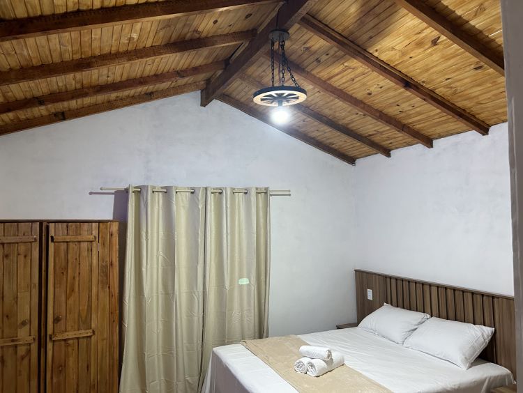 Sua cabana conta com cama de casal e um beliche para acomodar mais dois adultos ou duas crianças, frigobar, ar condicionado, lareira, tv tela plana, banheiro, estacionamento coberto ao lado da cabana.